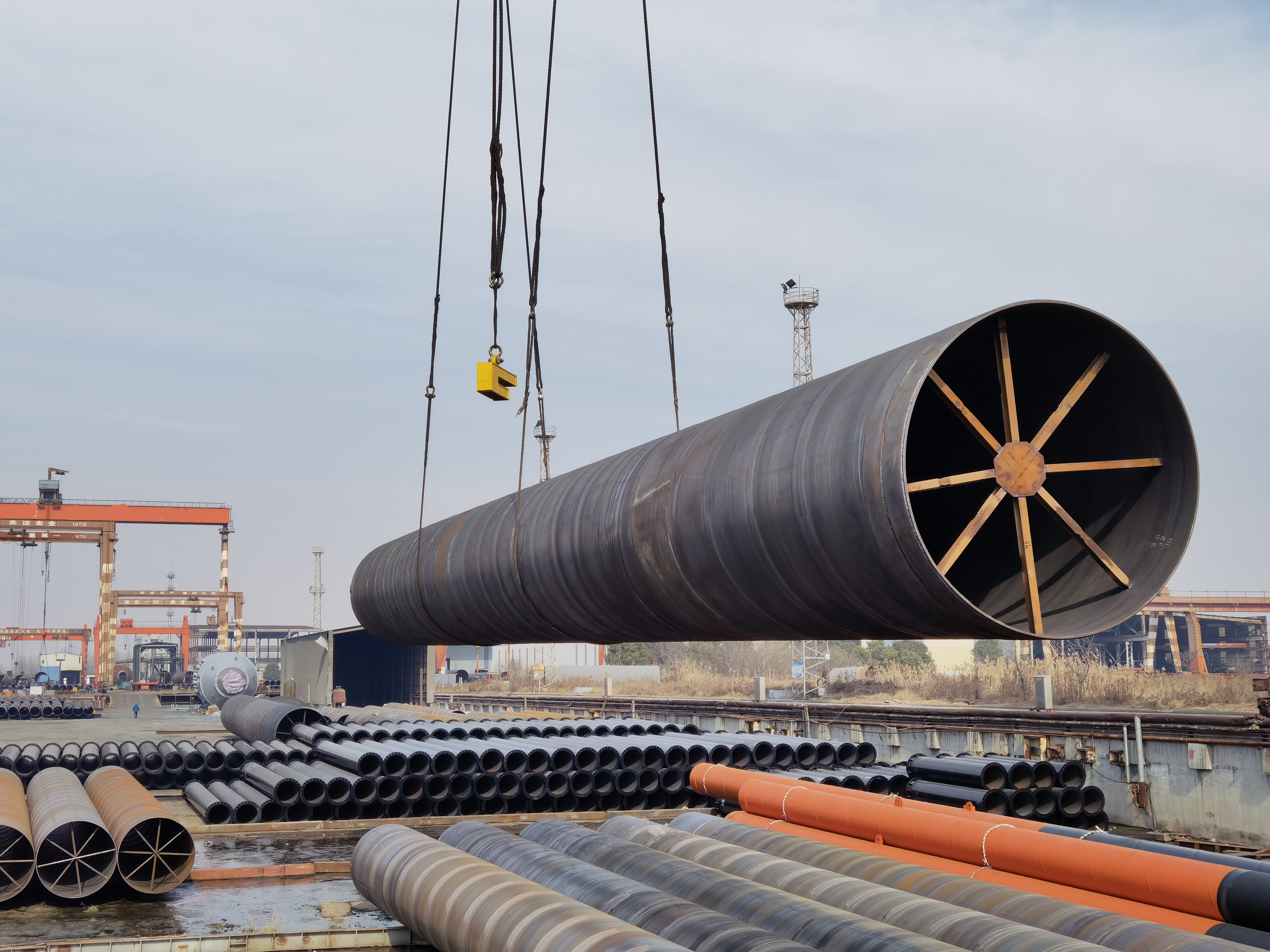 近日,在江蘇巨鑫石油鋼管有限公司(以下簡稱“JSGG巨鑫鋼管”)海工基地,工人師傅們冒著嚴寒,熱火朝天的生產(chǎn)著G3銅陵長江公鐵大橋鋼護筒,碼頭上一支支鋼護筒騰空而起,平平穩(wěn)穩(wěn)的吊運到運輸船上。